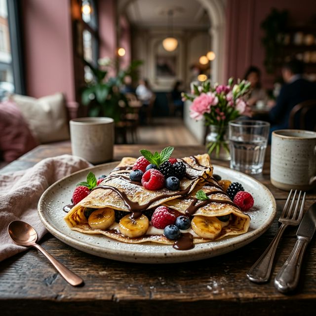 Boissons artisanales, crêpes gourmandes et douceurs maison dans un cadre chaleureux et élégant.